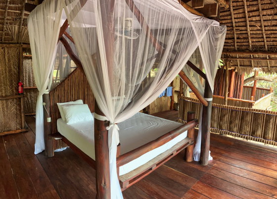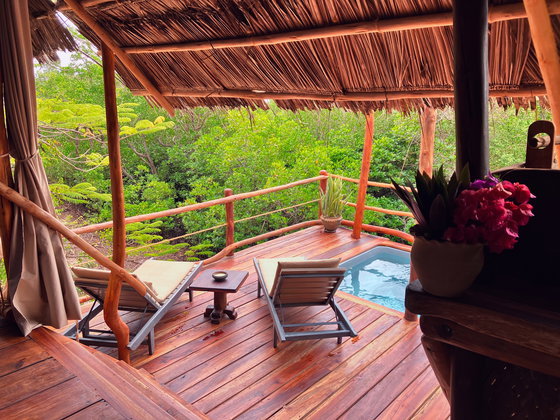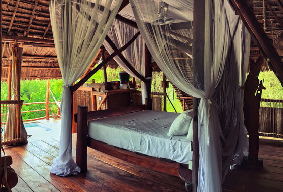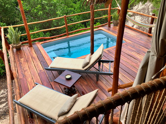 This treehouse stands out with its generous space, comfortably accommodating two adults and two children. The tea house offers breathtaking sunset views over the beach, where refreshing breezes sweep through, making it an ideal retreat. The large sun deck, complete with a private plunge pool, invites you to relax and soak in the tranquil surroundings. Inside, the treehouse is bathed in natural light, with a bright and airy bathroom that adds to its charm.